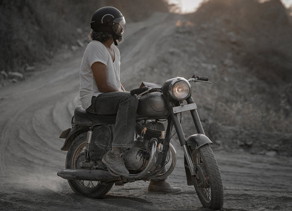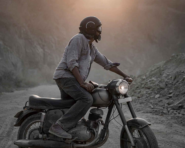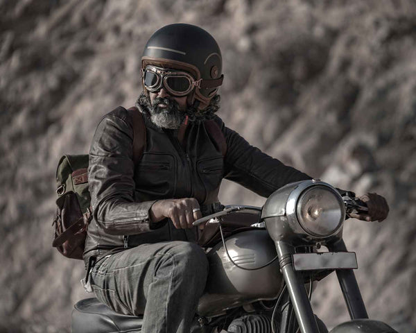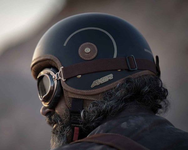 Che – A black helmet with a brown leather border and a pair of classy metallic copper goggles known as Ruin (copper-colored frame with dark shades).